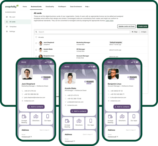 Die Funktionalitäten von snapAddy BusinessCards sind kostenlos – möchten Sie digitale Visitenkarten zentral im Unternehmen ausrollen bzw. die gescannten Kontaktdaten in Ihr CRM exportieren, benötigen Sie das kostenpflichtige Upgrade von BusinessCards. Mehr Informationen zu den Preisen finden Sie hier.